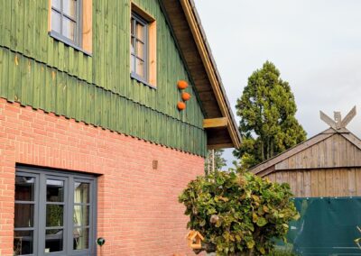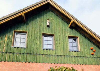In Kombination mit Holz zeigt sich die besondere Stärke dieses Farbtons. Das warme, lebendige Material bildet einen idealen Kontrast zum tiefen, gleichmäßigen Anthrazitgrau. Während die natürliche Maserung des Holzes Aufmerksamkeit auf sich zieht, sorgen die dunklen Fensterrahmen für visuelle Ruhe und Klarheit. So entsteht ein Gesamtbild, das modern wirkt, aber gleichzeitig Behaglichkeit ausstrahlt – perfekt für Häuser, die Natürlichkeit und klare Linien verbinden möchten.