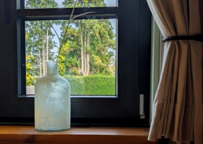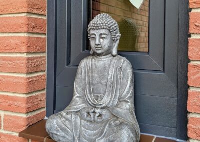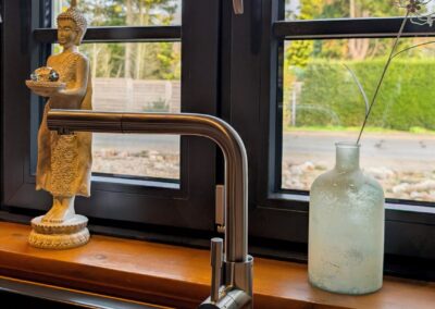 Die Fotos machen deutlich, wie anthrazitfarbene Fenster sowohl außen als auch innen für eine angenehme Balance sorgen. Im Innenraum lenkt der Farbton den Blick sanft nach draußen, ohne abzulenken. Die Fenster „rahmen“ die Aussicht, ohne sich selbst aufzudrängen. Außen tragen die harmonischen, dunklen Linien dazu bei, dass die Fassade optisch geordnet wirkt und Formen klarer hervortreten. Anthrazitgrau erscheint nie hart oder kühl – vielmehr wirkt es beruhigend und verbindend. Es schafft Übergänge zwischen Materialien, Flächen und Lichtstimmungen, ohne Aufmerksamkeit zu fordern.